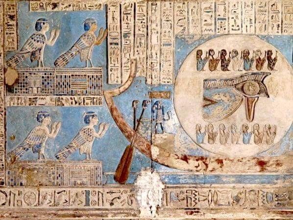 on the walls and ceilings, the massive columns with Hathor-headed capitals, and the famous Dendara Zodiac